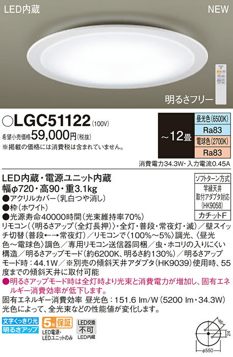 ‡‡‡βパナソニック 照明器具【LGC51122】天井直付型 LED(昼光色〜電球色) シーリングライト リモコン調光・リモコン調色・カチットF 〜12畳{E}