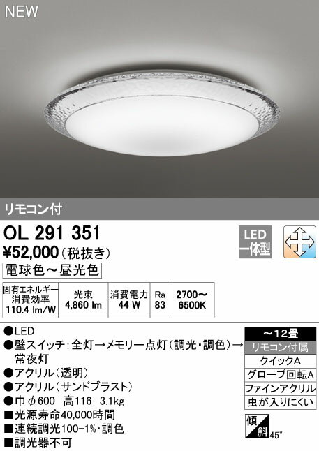 【最安値挑戦中!最大25倍】オーデリック OL291351 シーリングライト LEDシーリングライト 12畳 調光 調色 リモコン LED一体型 リモコン付属 〜12畳