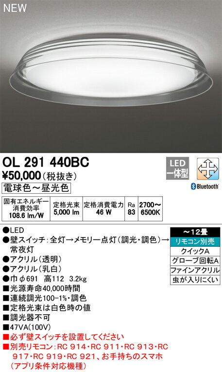 OL291440BCLEDシーリングライト 12畳用 自然美 水紋CONNECTED LIGHTING LC-FREE 調光・調色 Bluetooth対応オーデリック 照明器具 居間・リビング向け 天井照明 【〜12畳】