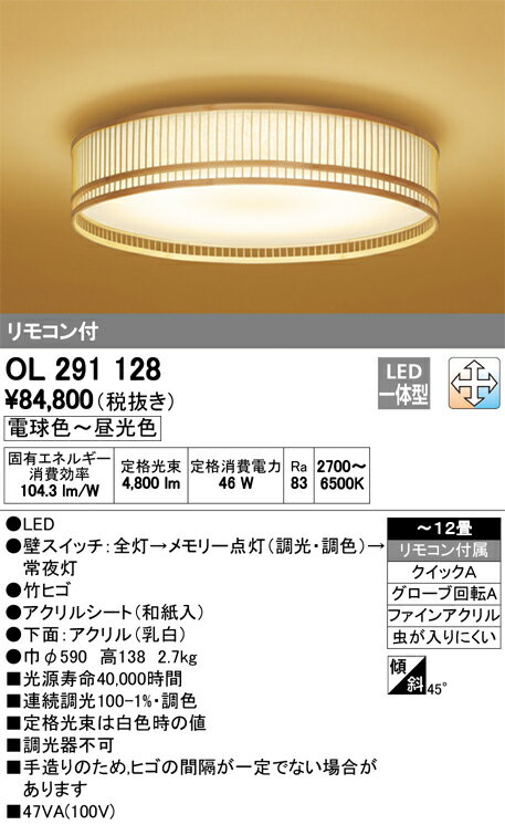 OL291128LED和風シーリングライト 12畳用リモコン付 調光・調色タイプオーデリック 照明器具 和室向け 天井照明 インテリア照明 【〜12畳】
